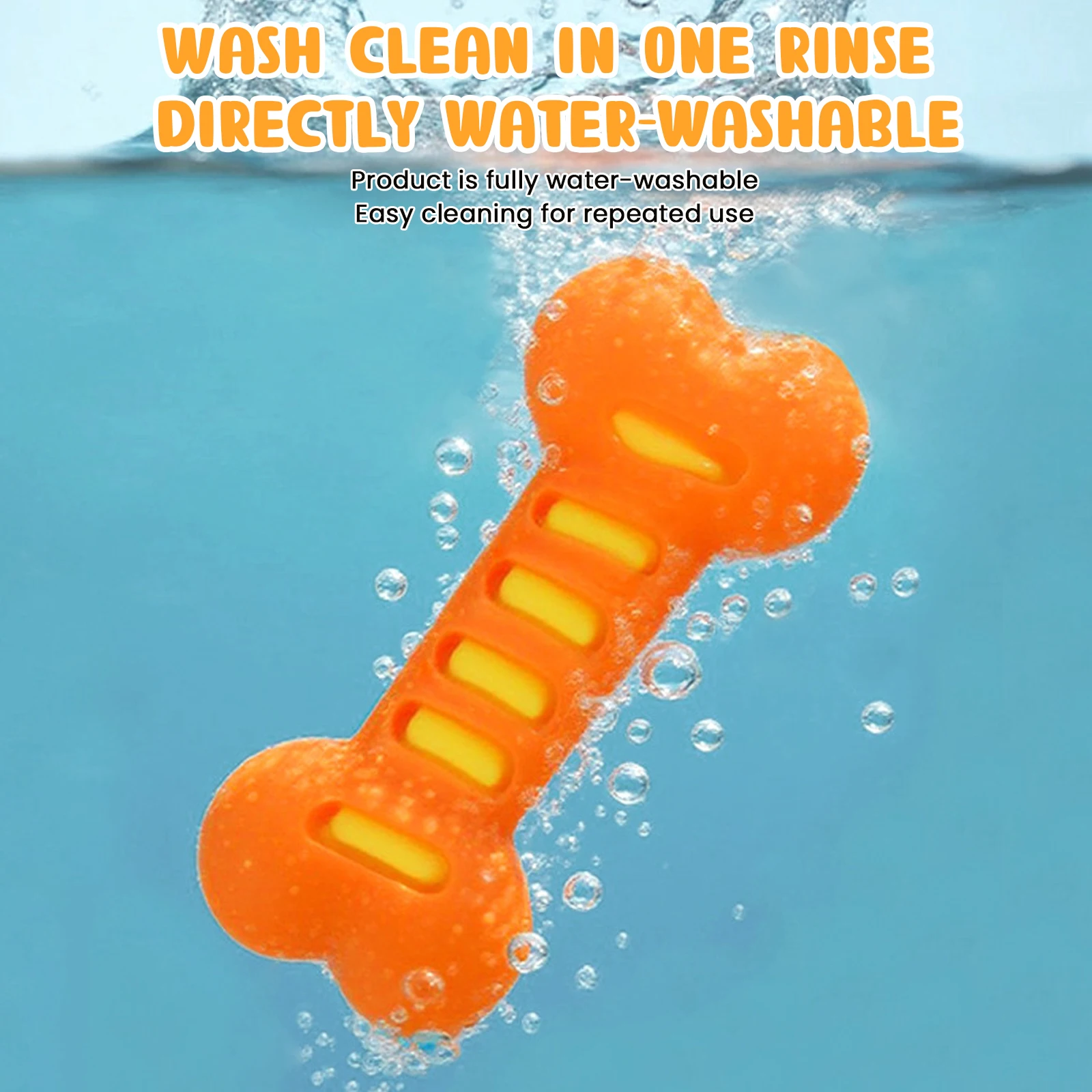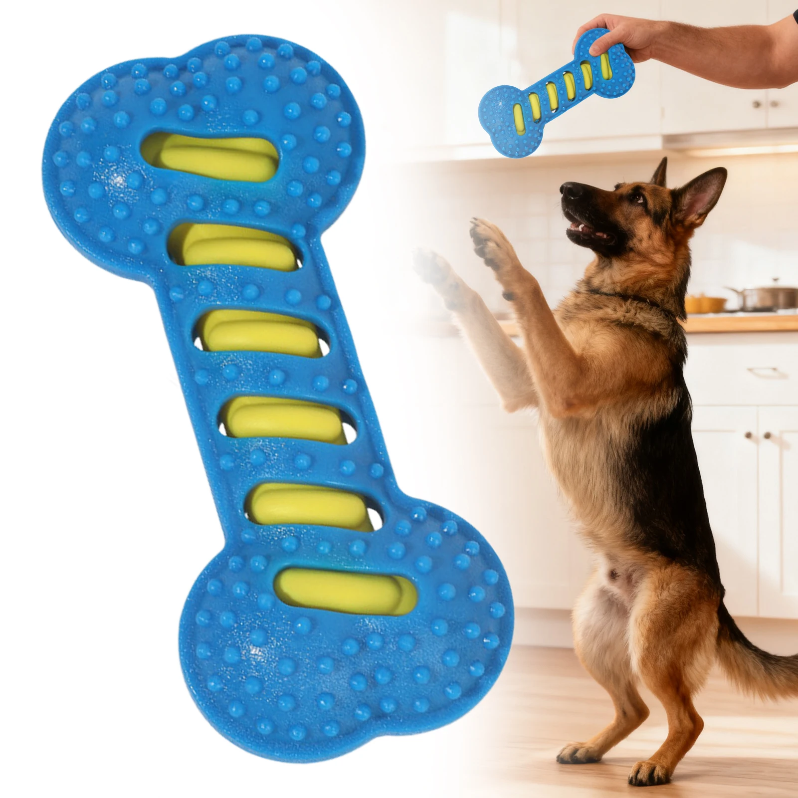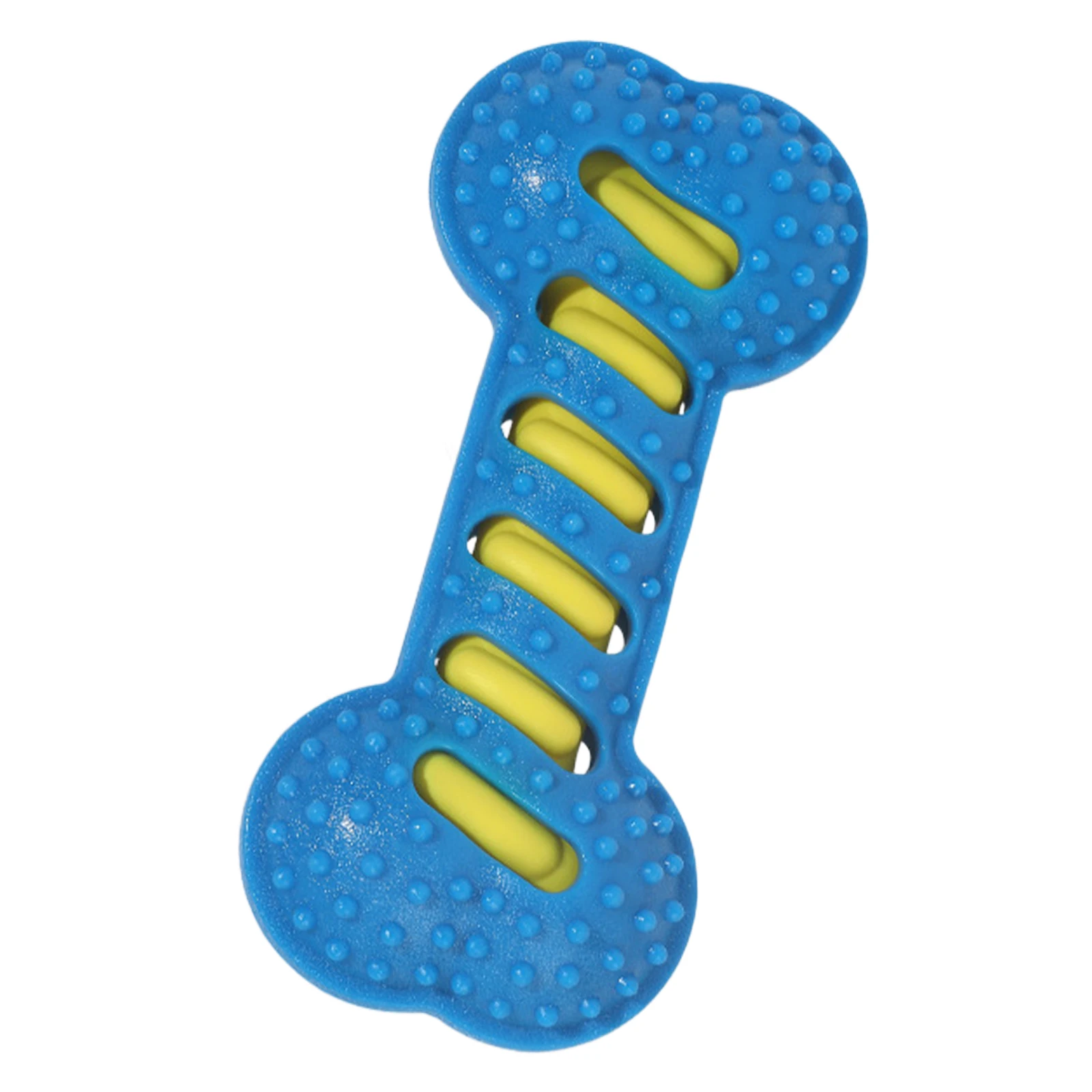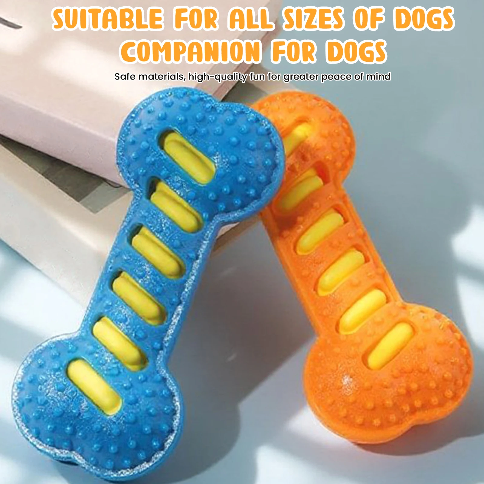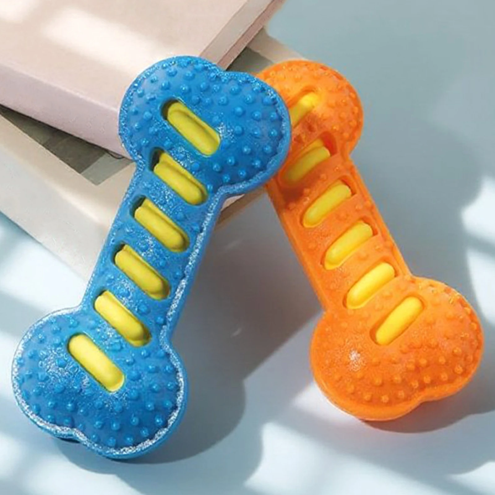 Features: 1.Sturdy TPR Rubber Construction: Our dog chew toy is crafted from tough TPR rubber, making it resistant to biting and wear. It features an internal sound layer that provides your pet with long-lasting interactive fun during play sessions. 2.Promotes Dental Health: The raised toothbrush-like bristles on this dog dental toy effectively help remove plaque and stimulate gums, supporting oral hygiene while your furry friend enjoys their favorite activity. 3.Multi-Use Interactive Fun: Designed for fetch training, solo play or interactive games, the teeth cleaning molar stick includes built-in sound effects to spark your pet's curiosity and keep them actively engaged. 4.Safe & Attractive Design: Made from non-toxic materials, our interactive massage toothbrush dog toy features textured surfaces to improve grip and enhance visual appeal for playful pups. 5.Ideal for Medium & Large Breeds: Ideally sized for golden retrievers, border collies, and other medium to large dogs who require a textured teething bone puppy chew toy designed for durability and energy-filled play. Specification: Material: PVC inner + TPR outer Color: Orange, Green, Blue (optional) Size: 20cm long * 9cm wide * 4cm thick (measured manually, slight variations may occur) Weight: about 116g per piece Suitable for: Medium to large dogs Note: